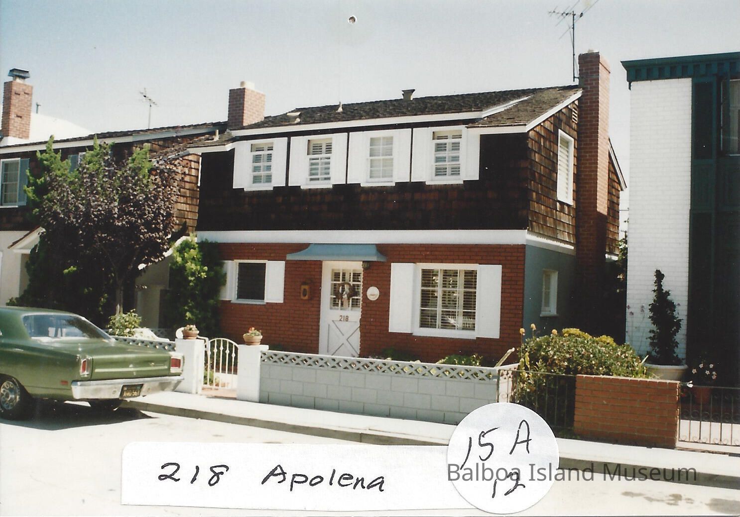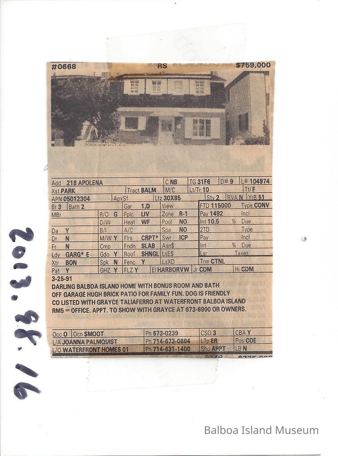 A color photo of home at 218 Apolena. Taped to reverse is multiple listing description. Photograph may have been taken during either the 1996 or 1998 sale of the property. The newspaper clipping on the back is from 1998. The house was listed at $759,000 and sold for $775,000 in 1998.Lexicon