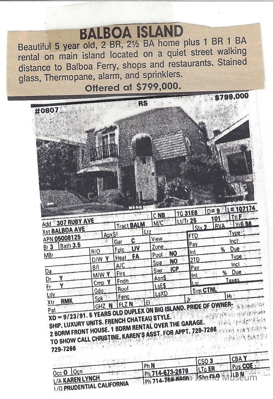 A color photo of home at 307 Ruby Avenue. Taped to reverse is multiple listing description.