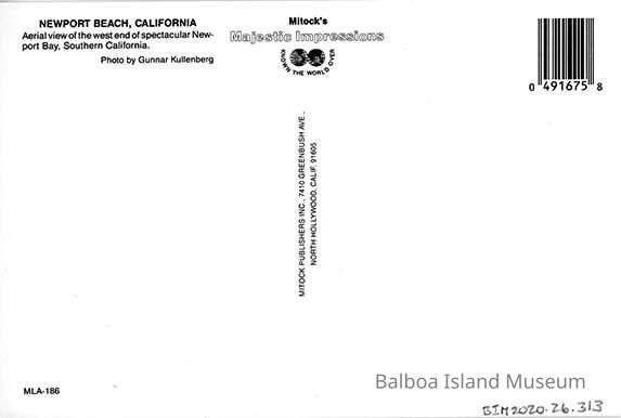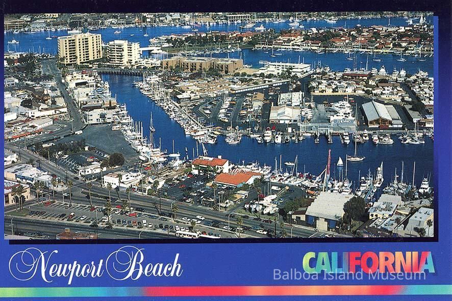 A color aerial postcard of the Lido-Newport area. The Lido Peninsula is in the middle with Newport along the bottom and Lido Island along the top/ Black to blue gradate background with "California" in rainbow and a rainbow bar at the bottom.