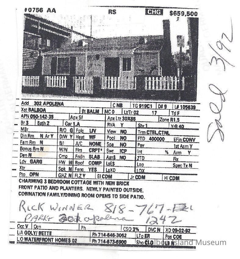 Color photo of 302 Apolena Avenue. Taped to the back side of the photo is multiple listing descriptions and a note that home sold March 1992.
