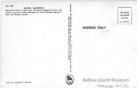 A color photograph postcard of the Balboa Pavilion Harbor Cruise boat docked beside the Balboa Pavilion. There are people boarding the boat and some are already seated waiting for the cruise to begin. The boat name is Pavilion.