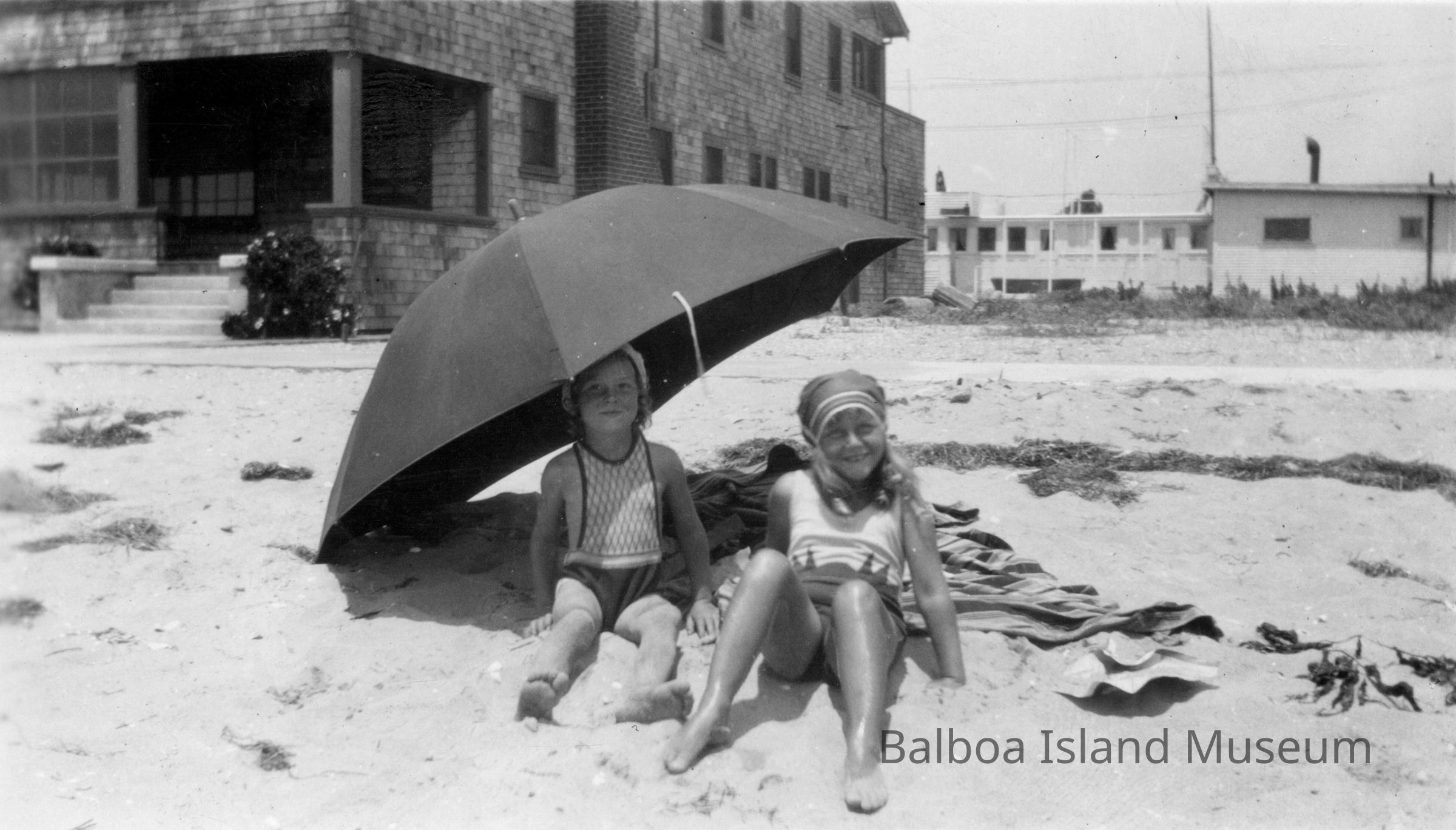 B&W photo of two girls on the beach under an umbrella.