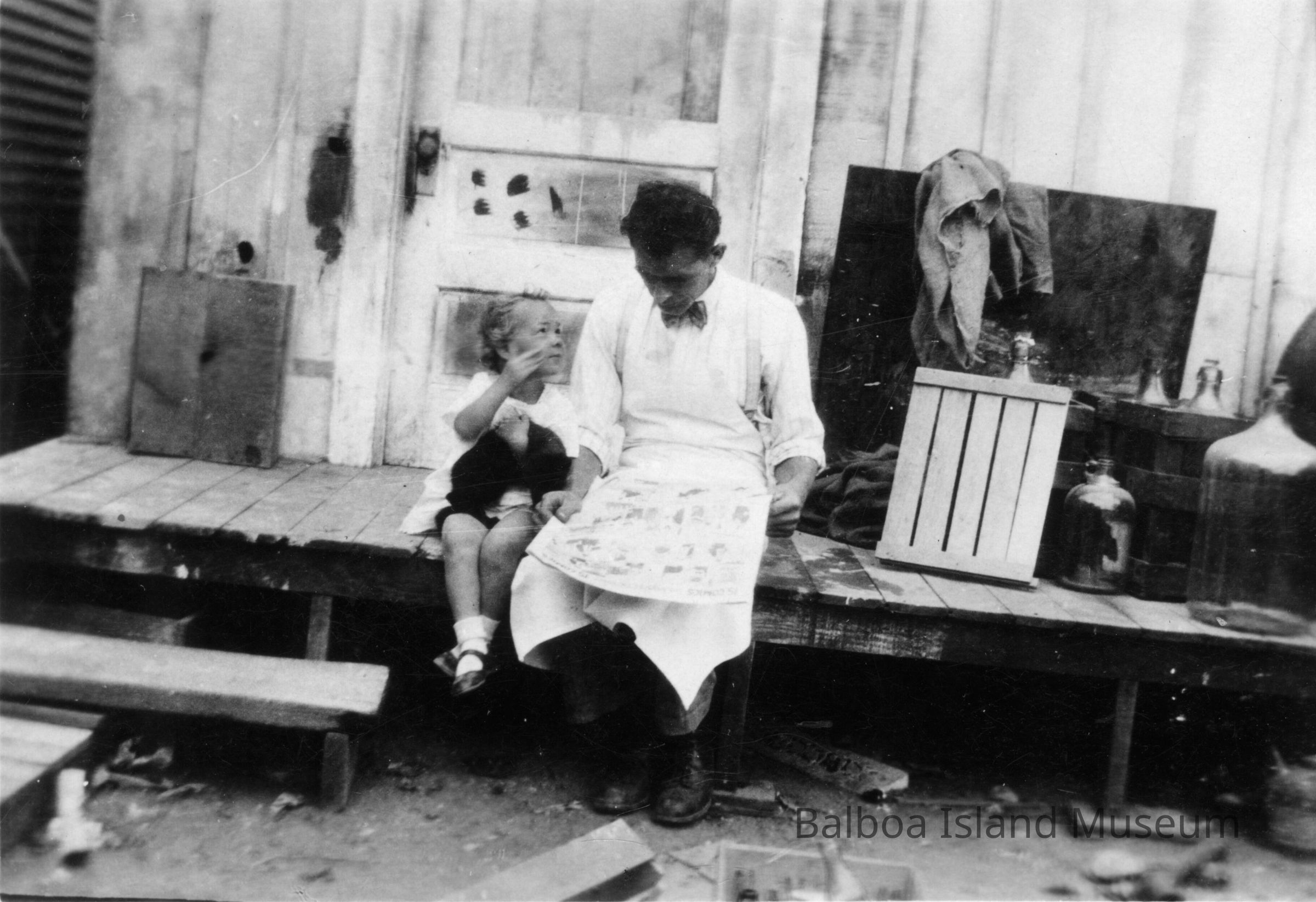 B&W photo of man and child reading newspaper titled Tony and Ruthie reading the funny paper. Contact sheet says Daddy is reading funny paper to Ruth (In the back of Wally's market) (Tony learned to read English with the help of reading the funnies).Collection