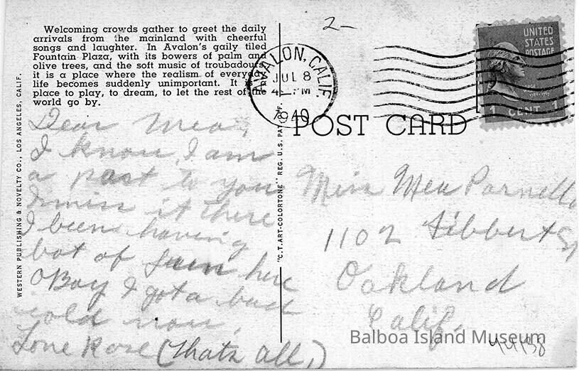 Sent on July 8, 1940 from Avalon to Miss Mia Parnello in Oakland, California. Published by Western Publishing & Novelty Co. and printed by Curteich-Chicago (C. T. Art-Colortone). Postcard number OB-H406.