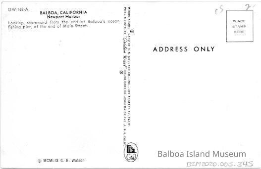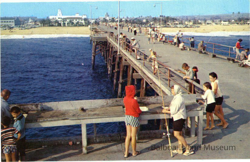 A color postcard with an image taken from the end of the Balboa Pier looking towards the Balboa Beach. Taken from in front of the long prep table for fisherman to use on the pier that sits on the west side of the platform at the end of the pier. Two women are stepping up to the table in flipflops, perhaps to prep a fish. The Balboa Inn is visible in the background along with the cupola of the Pavilion.