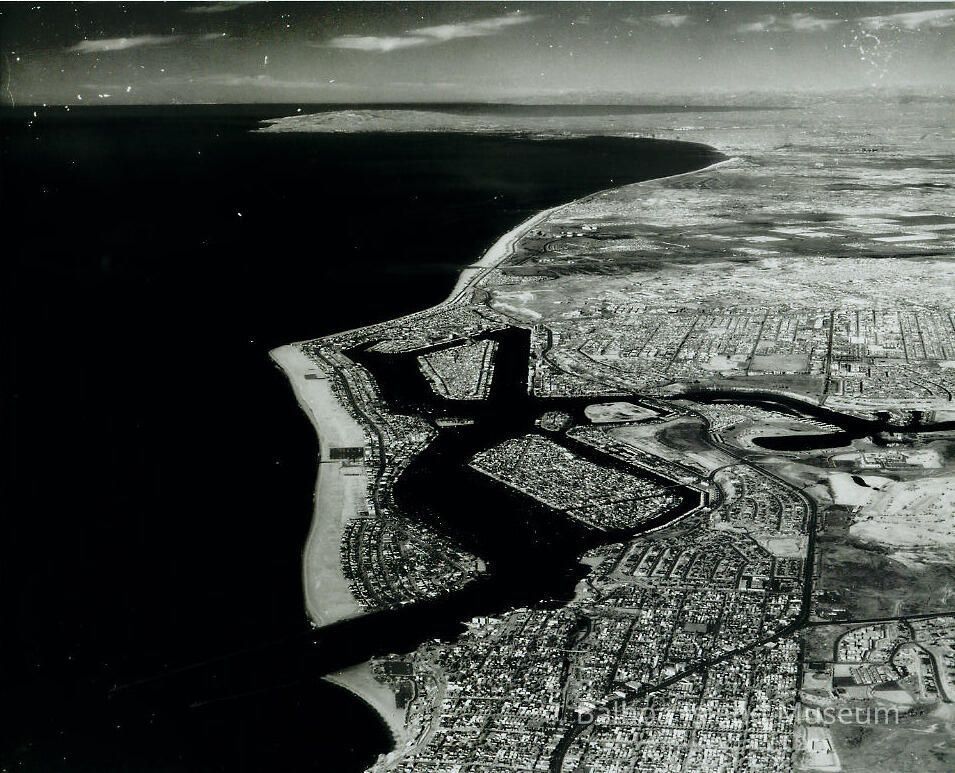 B&W aerial photo of Newport Beach. Reverse says 1965.Lexicon