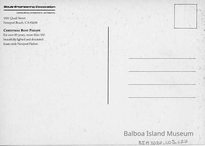 Unused. No publication information, though it is set up in the same format as the Steve Simon postcards printed in series. The back has the address for Boyle Engineering Corporation and some historic information on the Christmas Boat Parade.Subject