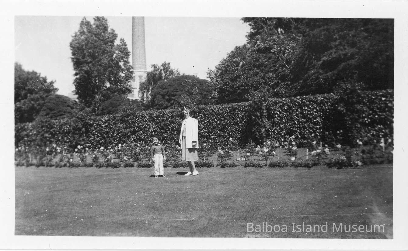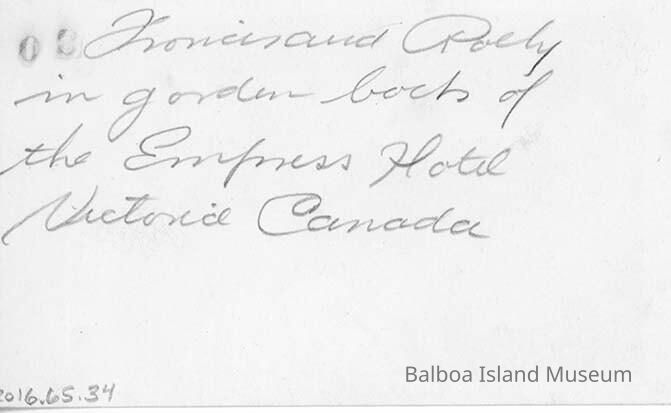 A black and white photograph of Frances and Rolly Pulaski in a garden. Back reads: Frances and Rolly in garden back of the Empress Hotel, Victoria, Canada.