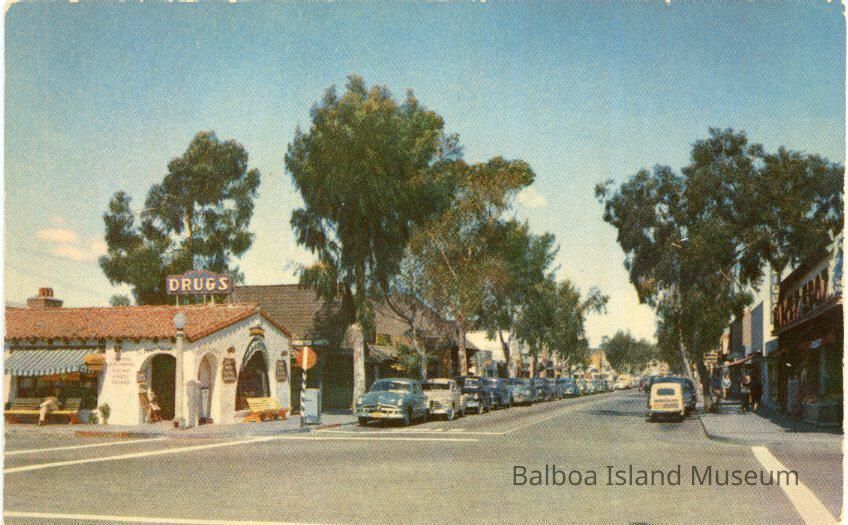 A photograph postcard looking up the 200 block of Marine Avenue towards Irvine Terrace. It was taken from the intersection of Marine and Park in front of the current Fire Station and is angled towards the Pharmacy.