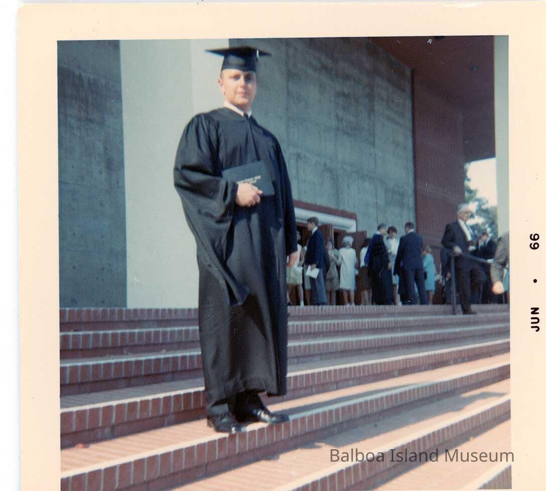 A color photograph of Gary Caldwell standing on the steps of a building holding his diploma. He is in his graduation outfit.