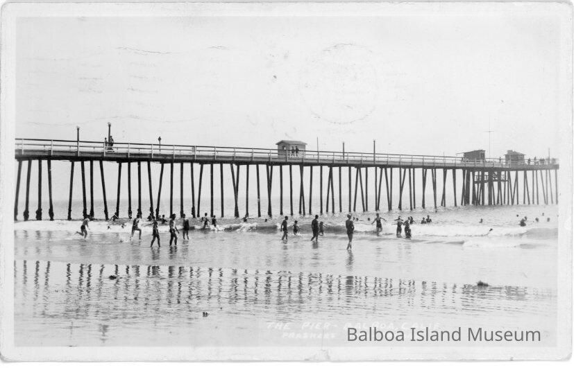 A photograph of either the Balboa Pier taken from the beach and numerous swimmers are visible. There are three buildings and a small lower platform visible on the pier. The platform was removed at an unknown date.