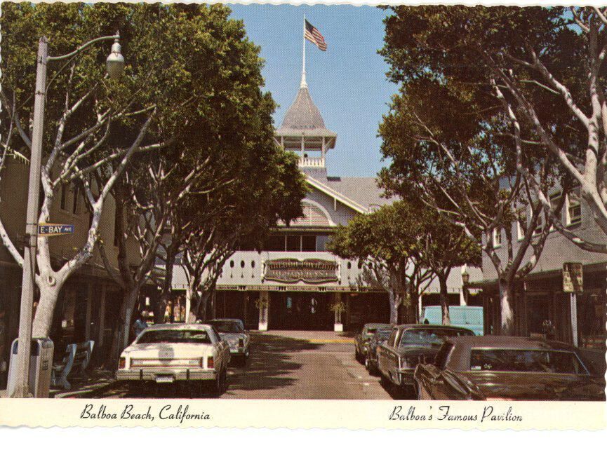 A color photograph of the Balboa Peninsula taken from the E. Bay/Main st intersection. White border on the bottom reads Balboa Beach, California Balboa's Famous Pavilion. Scalloped edges. There are trees lining the street.