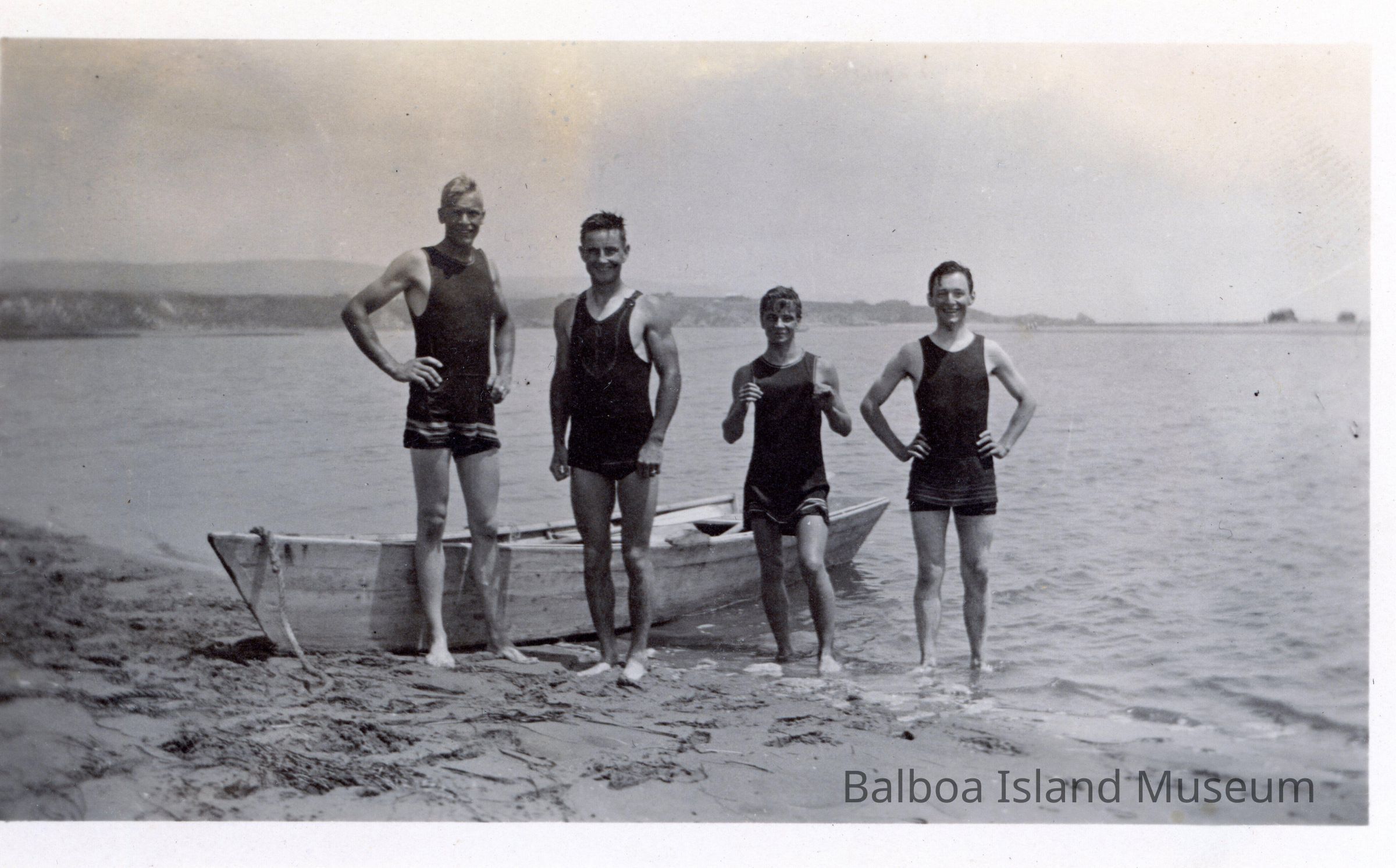 A photograph of four men in bathing suits standing in front of a row boat on the shore of Balboa Island. The tall man on the left should be Kenneth Smith. Taken around July 4, 1911. Adhered to black album page 1.