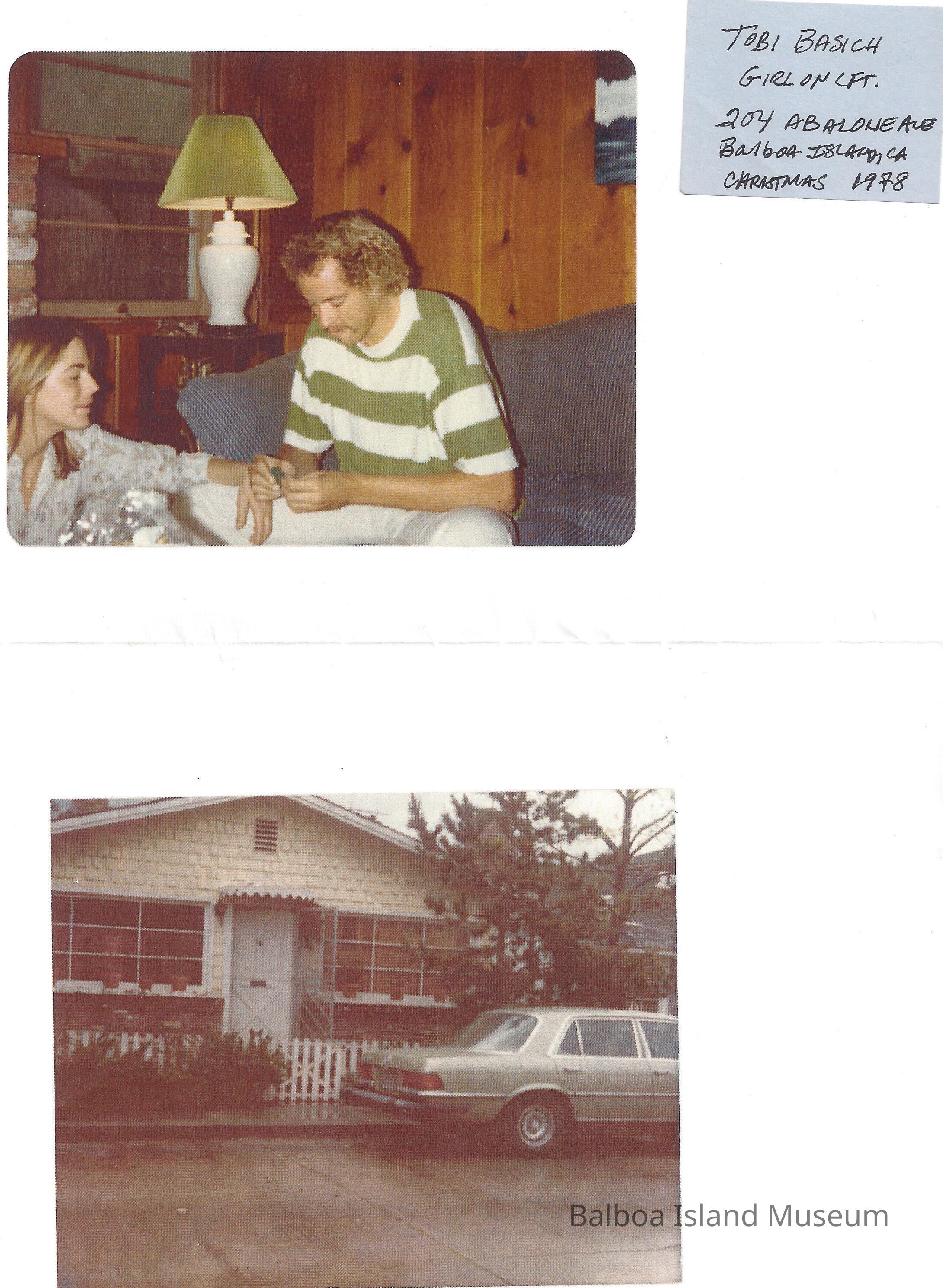 Copies of two photos - one of house and one of man and woman. Tobi Basich is the girl on the left. The house is 204 Abalone Avenue around Christmas of 1978Lexicon