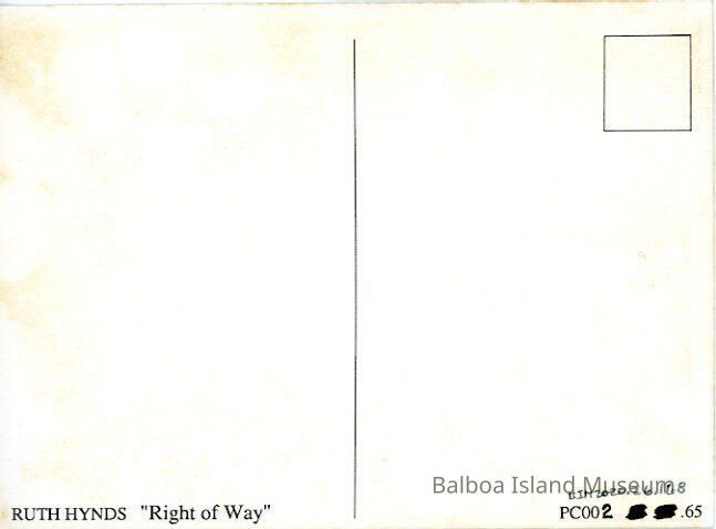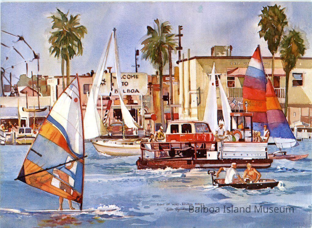 A color postcard featuring Ruth Hynd's "Right of Way-Balboa Ferry" painting done on 9/9/84. There are several sailboats and a wind surfer crossing the water with the Ferry moving between them towards the Balboa Peninsula dock. Number PC002.Subject