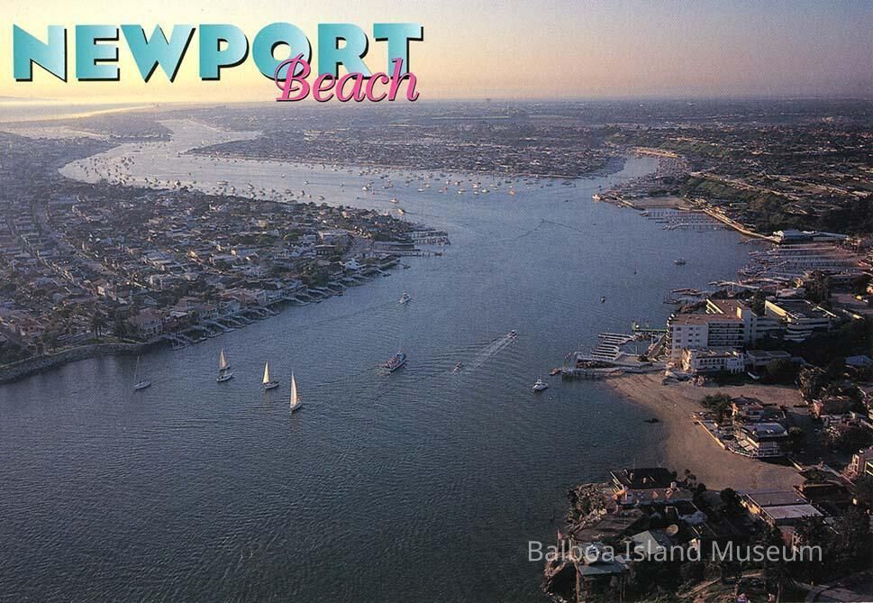 Two copies of a color aerial postcard of thew Newport harbor taken from over the entrance. Looking towards Balboa Island with Lido Island in the distance.,