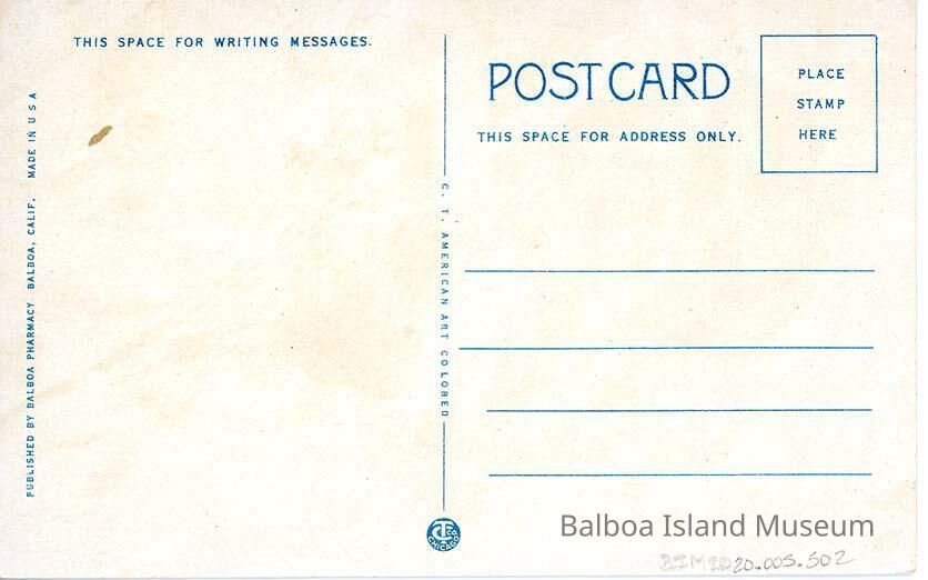 Unused. Published by Balboa Pharmacy in Balboa and made in the USA. Printed by Curteich-Chicago (C. T. Photochrom) in Chicago. Postcard number 84039.Subject