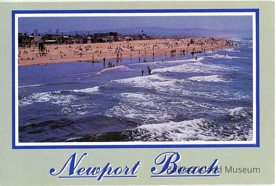 A color photograph postcard taken from out on the water looking towards the beach at the bend along the Newport Beach area. There are people playing in the waves and hanging out on shore. Green border and blue-white frame with Newport Beach printed and underlined in Blue and white shadow along the bottom.