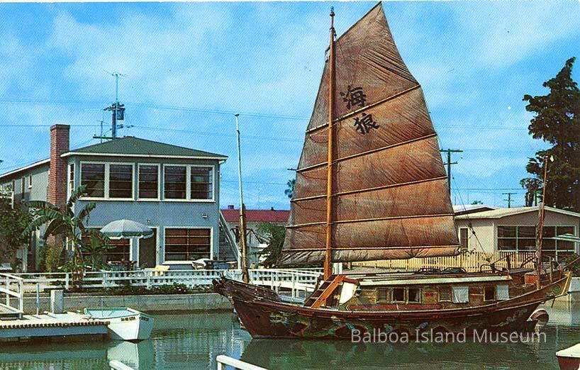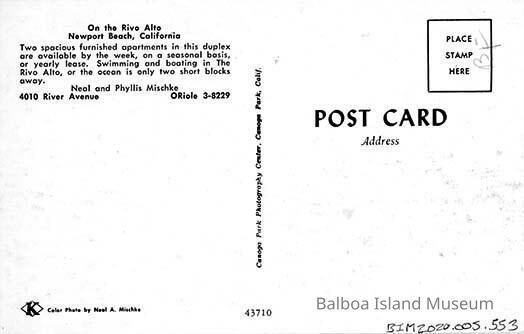 A color photograph postcard of a two story rectangular shaped house with a Chinese Junk-style ship in front of it. The building appears to still be there. It was owned by Neal and Phyllis Mischke, who were at phone number ORiole 3-8229. The building was located at 4010 River Avenue in Newport Beach.