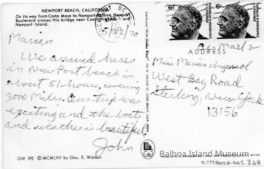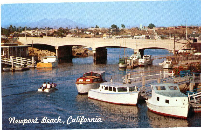 Two copies of a color postcard of the bridge to the Balboa Peninsula taken from the water or a dock. It appears to have been taken from the Peninsula side of the bridge. One of the copies has white writing on the front bearing the title in a cursive-style font.