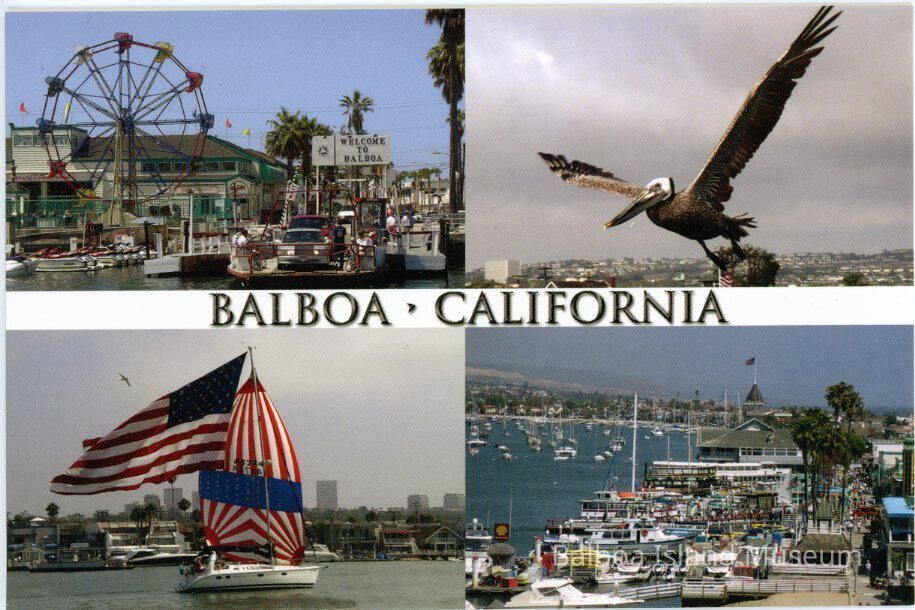 A color collage postcard with four photographs around the words "Balboa - California". Top left: Fun Zone Ferris wheel and ferry landing, top right: pelican, bottom left: Sail boat fearing a huge American flag and red, white, and blue sails, and bottom right: the docks beside the Pavilion.