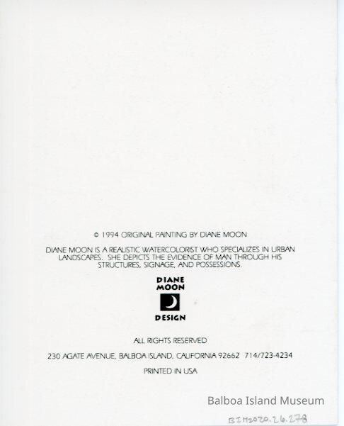 A notecard with a print of a painting by Diane Moon of the Ferris Wheel at the Balboa Fun Zone. The Auto Ferry and U-Drive signs are behind it on the left.Collection
