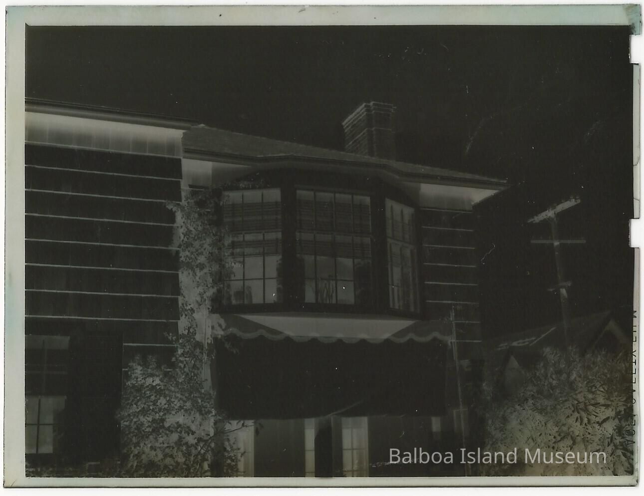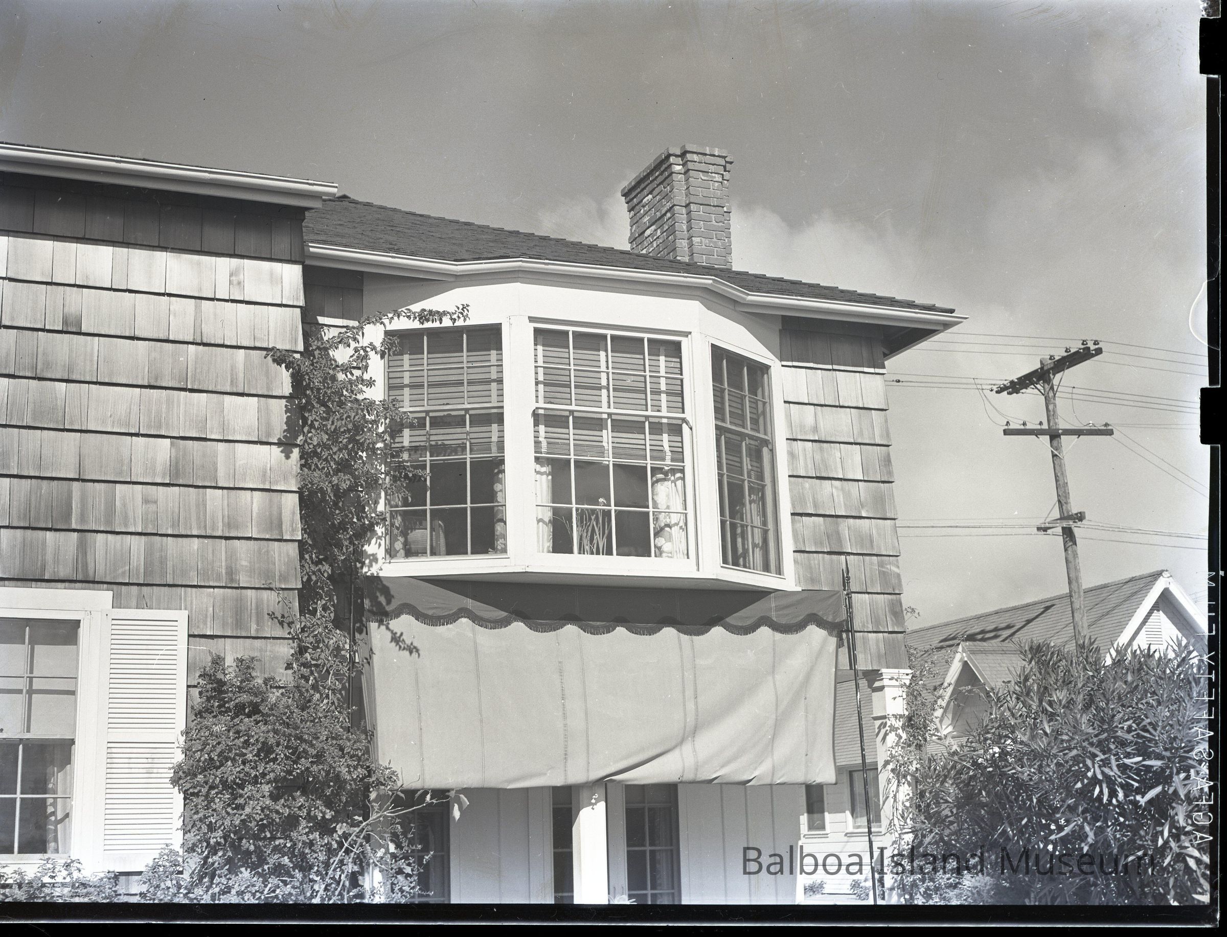 A close up of a Bay Window set in a two story shingle house just below the roof line. The roof is a four-sided slopping one. The chimney is a geometic shape rather than purely rectangular. Envelope just says Mrs. Mowers house. House is 552 South Bay Front.