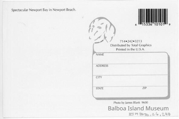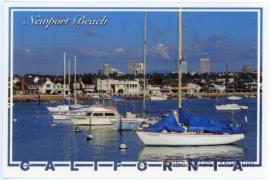 A photograph of Newport Harbor looking towards Newport Center. Four sky scrapers and the Island Hotel are visible in the background. The 540 block of South Bay Front is visible in the background behind the ships.