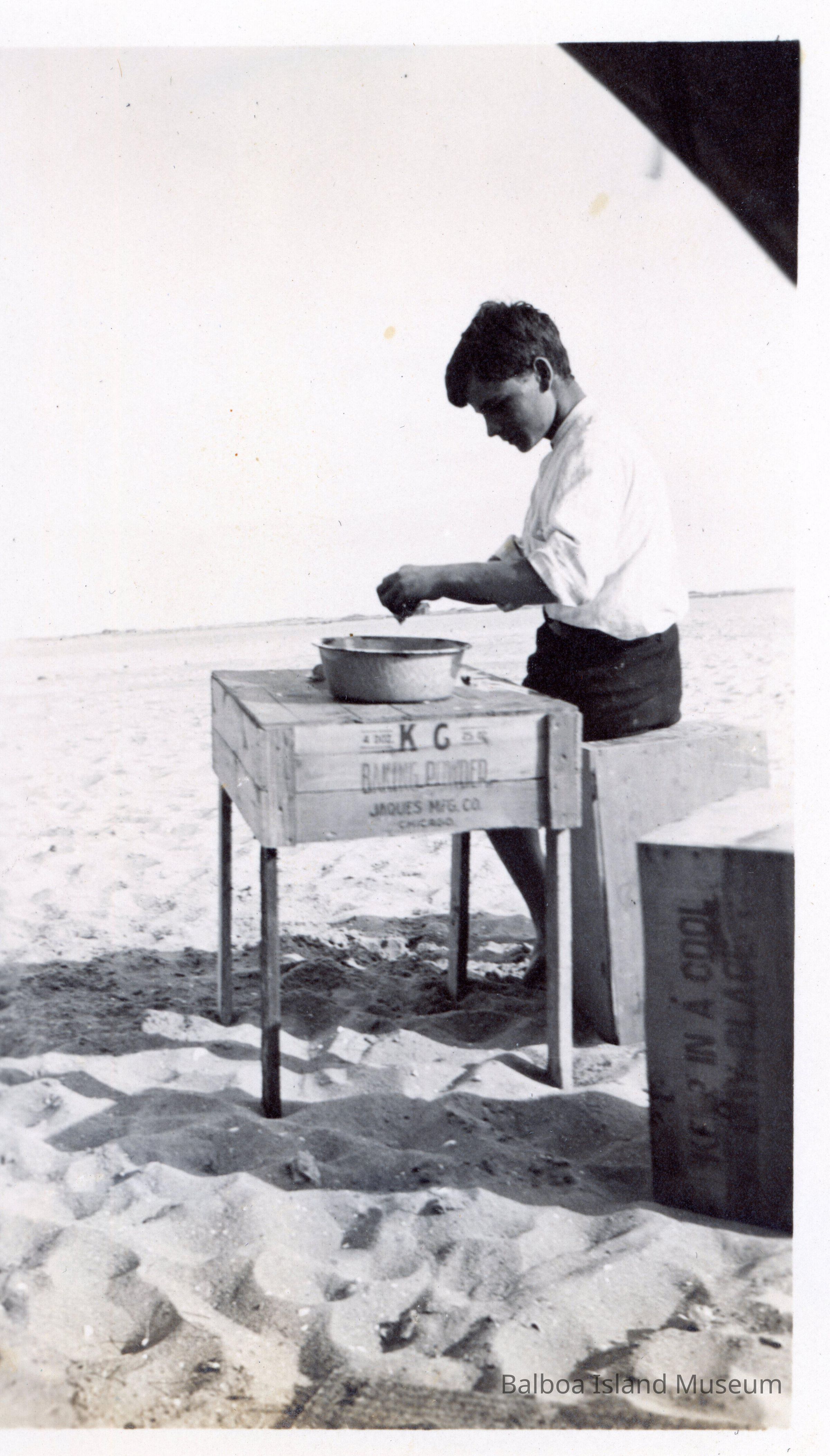 A photograph of a young man shucking clams at a small basin on a makeshift table. He is seated on a crate on the sand. The table was made from a cut off portion of a grate and four pieces of wood for legs. Taken around July 4, 1911 from inside the tent. Adhered to black album page 1.