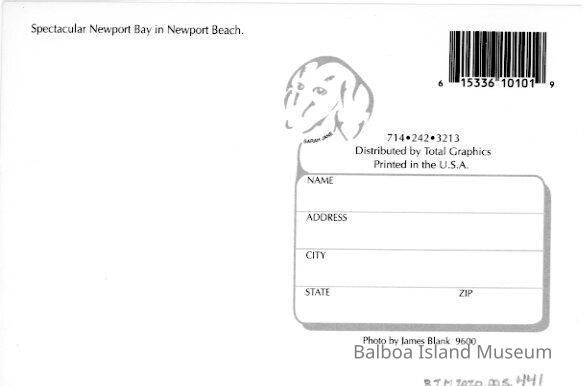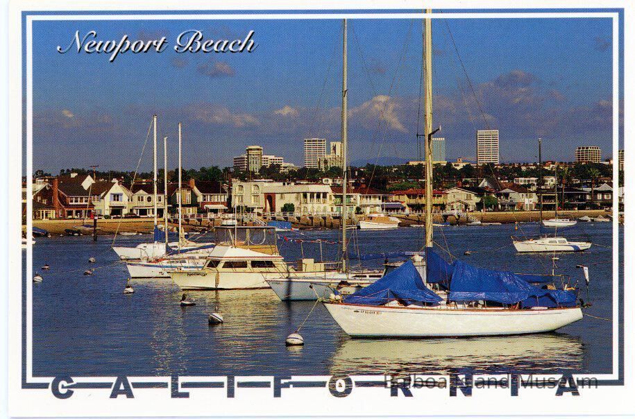 A color photograph postcard of Newport Harbor looking towards Newport Center. Four sky scrapers and the Island Hotel are visible in the background. The photograph was taken on the harbor from off the 500 block of South Bay Front. The segment of the 500 block between Turquoise and Collins Avenue's is visible in the photograph as well as the 600 block of South Bay Front. There are several boats anchored off the shore by buoys between the photographer and the Island. Newport Beach is printed in white in the upper left corner of the photograph. California is written along the bottom of the photograph in a cutout style so some of the photograph can be seen behind the word. The entire photograph is framed with a white border.