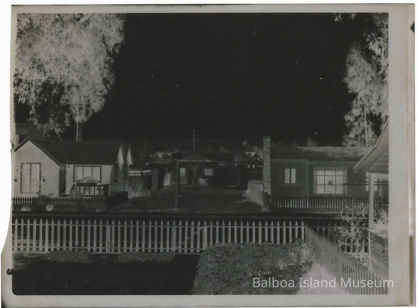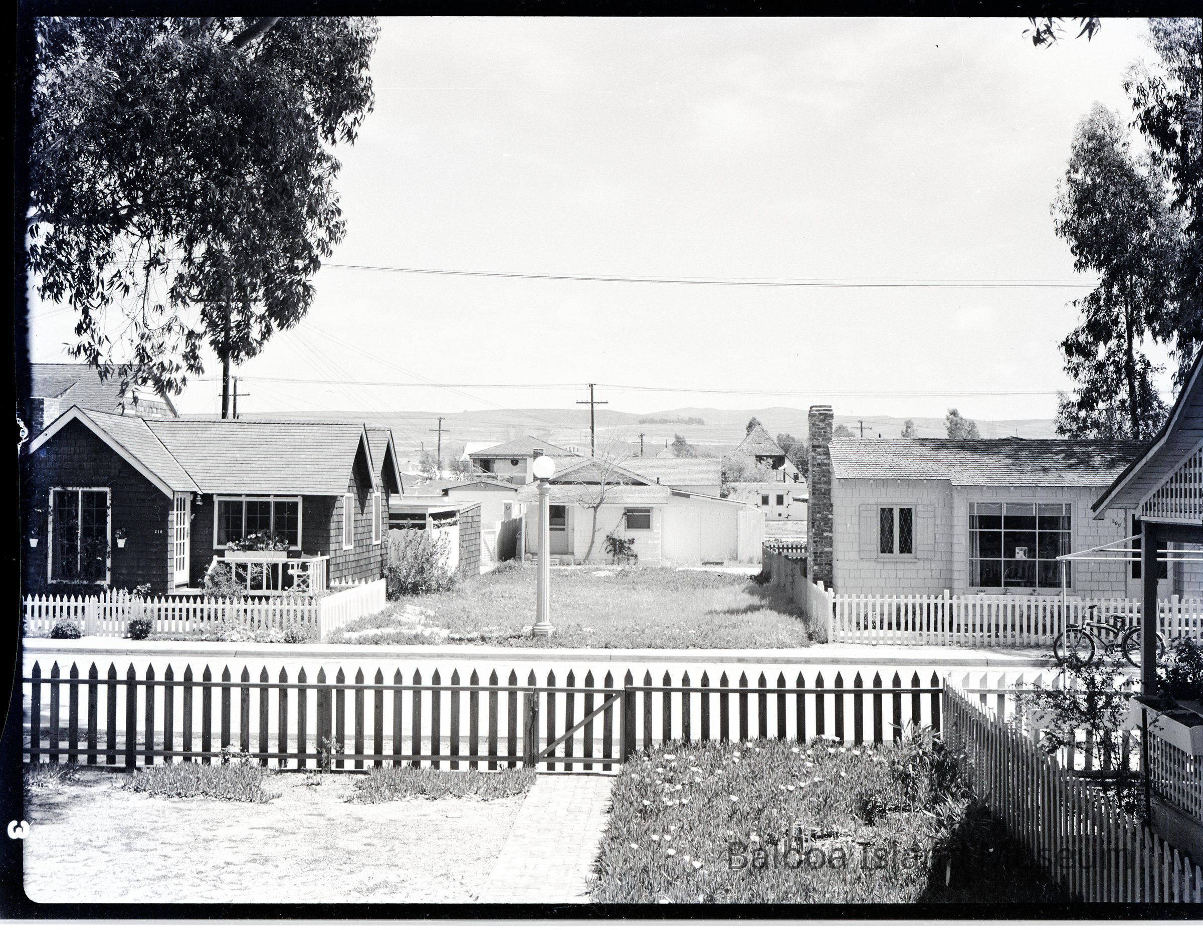 A photograph of an empy 208 lot. The builts on either side, 210 and 206 have been built. The photograph was taken from the patio of a house immediately across the street, likely 209.