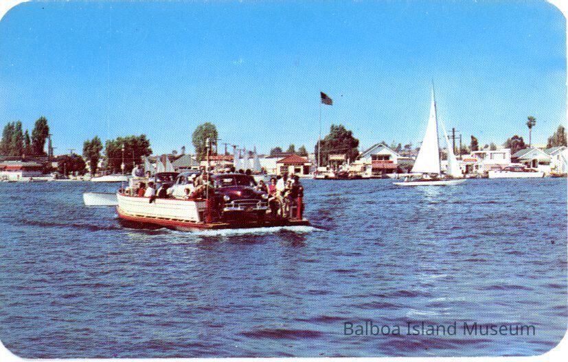 A photograph postcard of the Balboa Island Ferry crossing to the Balboa Peninsula dock with the Beek building visible in the background.