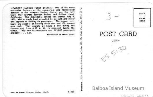 There is a blurb in the upper left hand corner about the Balboa island Ferry written by R. D. The photograph is by Merle Porter. Published by Royal Pictures in Colton, CA and printed by Dexter Press in Pearl River, NY. Postcard number 54422.Subject