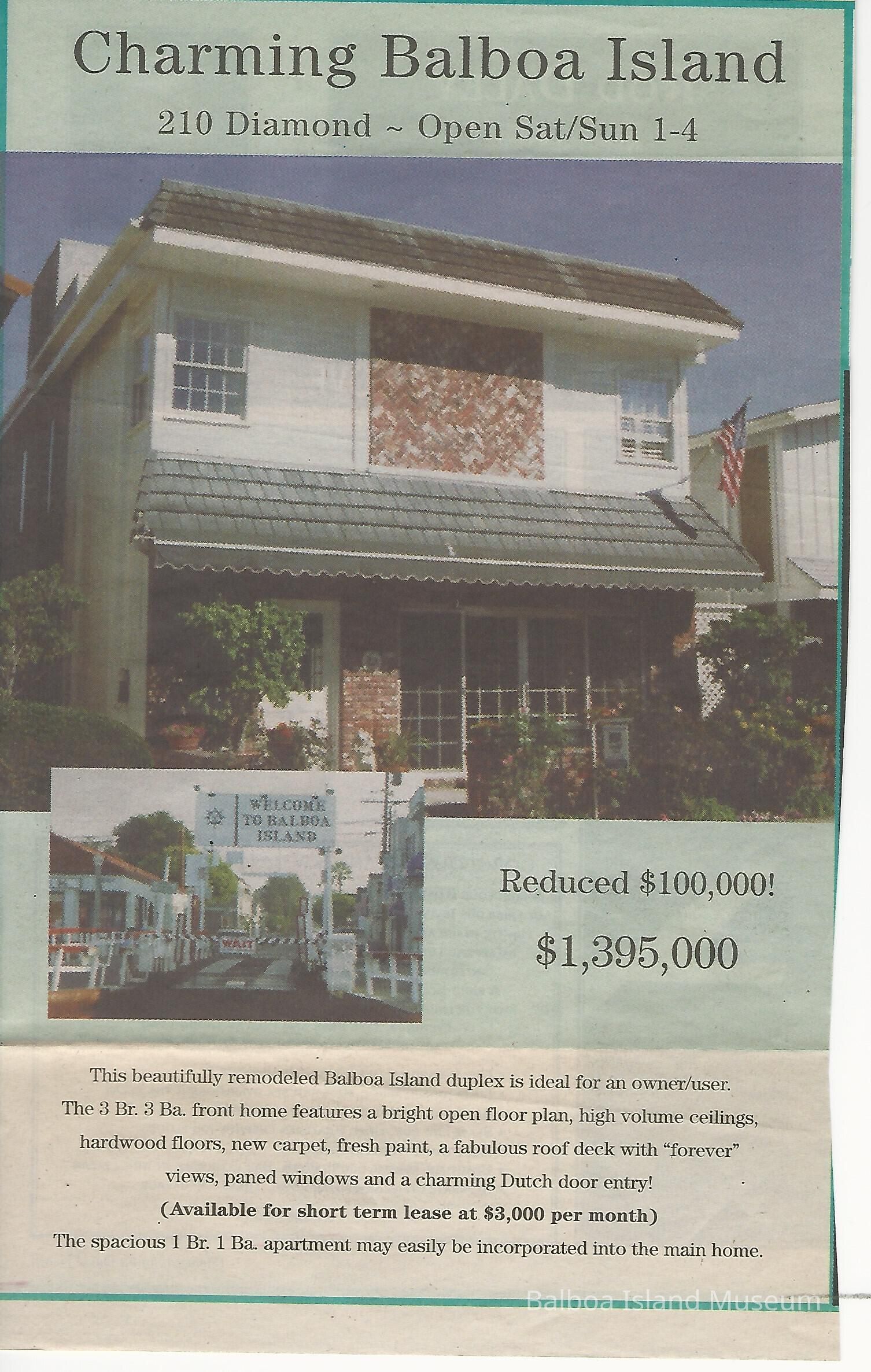 An advertisement clipped form a newspaper about the sale of 210 Diamond Avenue. It lists the open house time and days, includes a blurb underneath about the house, and announces the price was reduced by $100,00, making it $1,395,000.Title