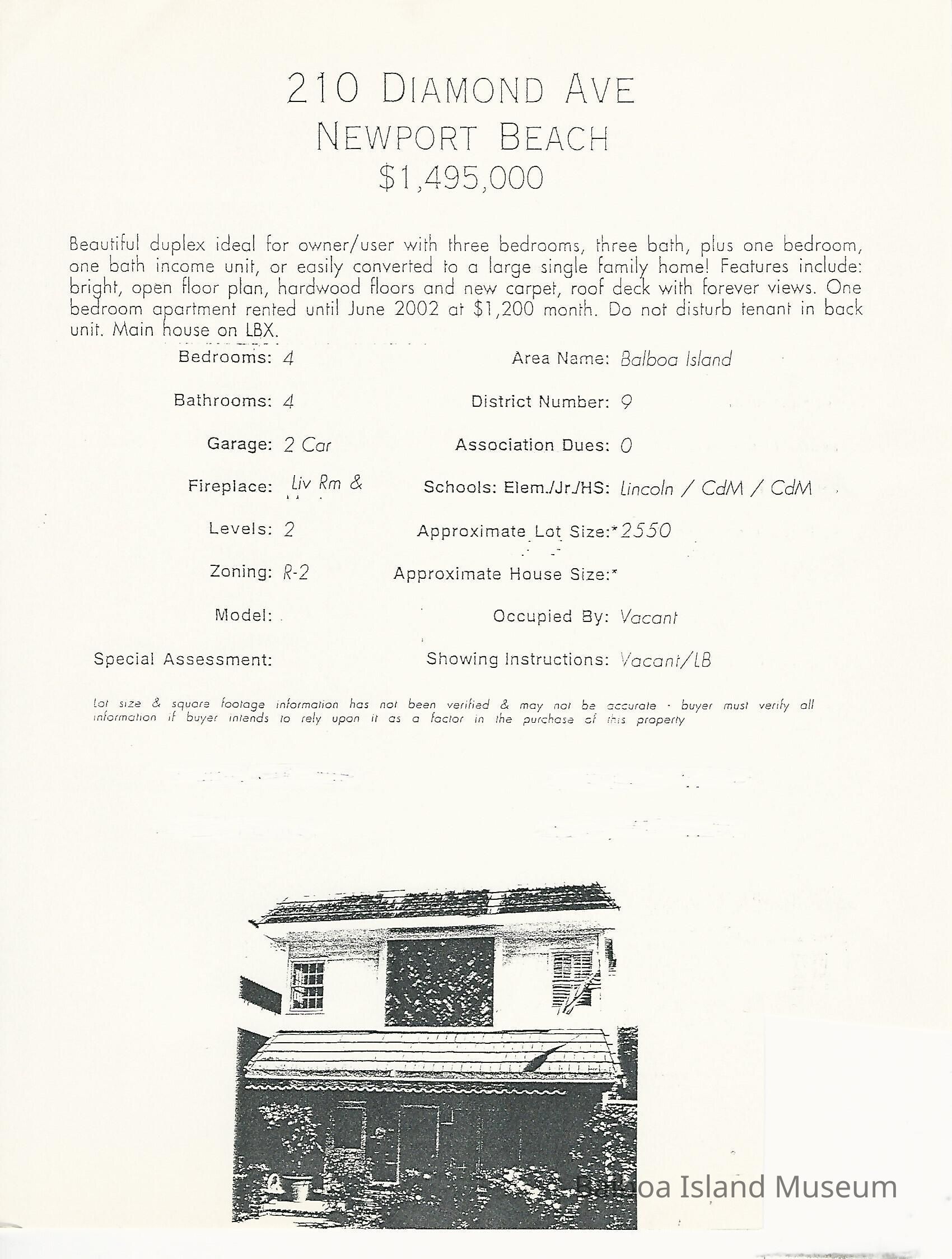 A black and white flier for 210 Diamond Avenue printed in glossy paper. The flier includes a blurb about the house, some technical information about the house, property, and schools, and cites the price as $1,495,000.Title