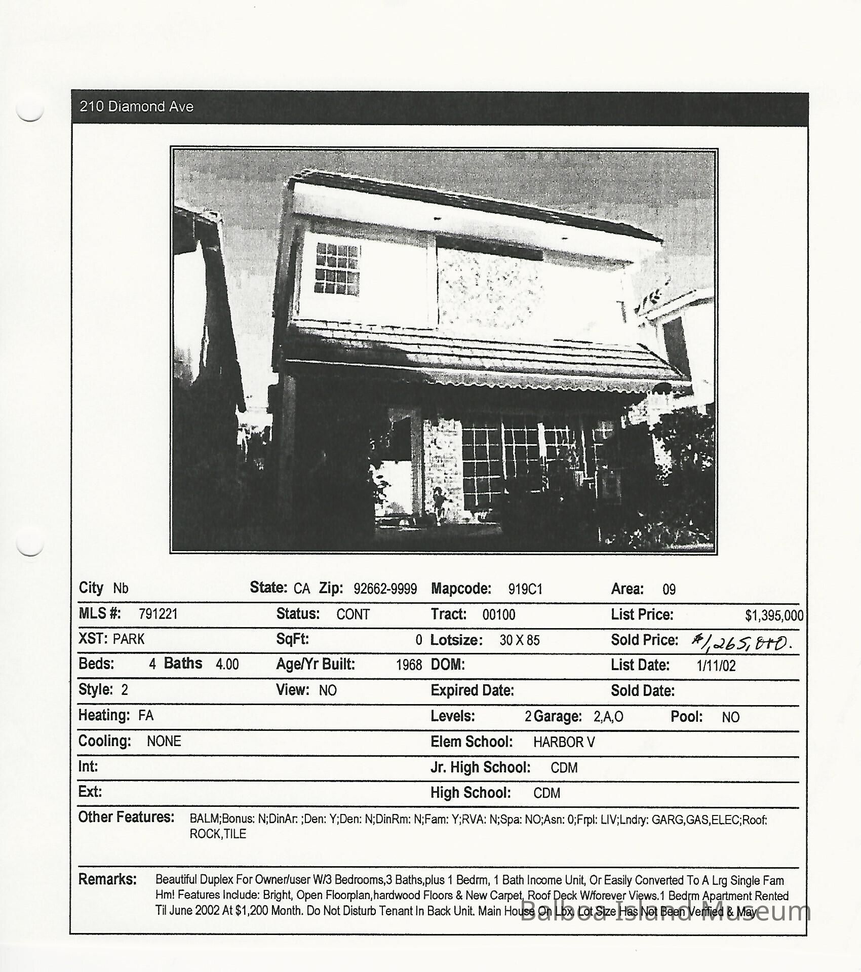 A printout of a black and white information sheet for 210 Diamond Avenue. The sheet includes technical specks, year built (1968), and the List and sold prices. There is also a list of other features and a summary description.Search Terms