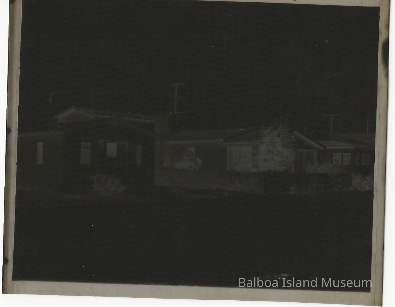 A negative of two unknown houses, possibly on Ruby. The houses are from about 1938. No house numbers are visible. Might be identifible based on the very last house visible in the photograph. The envelope says it is 118 Sapphire, and the very last house could be 118 Sapphire. But it is difficule to say.Lexicon