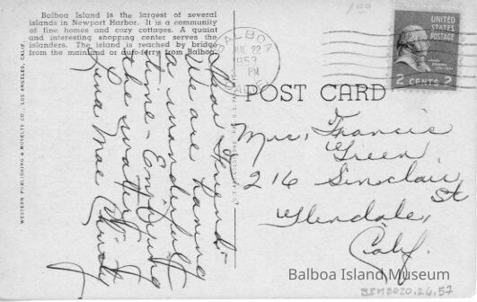 Sent to Mrs. Francis Green in Glendale, California on July 22, 1953, from Lena Mae, Christy. Published by Western Publishing & Novelty Co. in Los Angeles. Printed by Curteich-Chicago (C. T. Art- Colortone). Sent with a 2-cent red John Adams Postage stamp on July 22, 1953, from the Balboa Post office.
