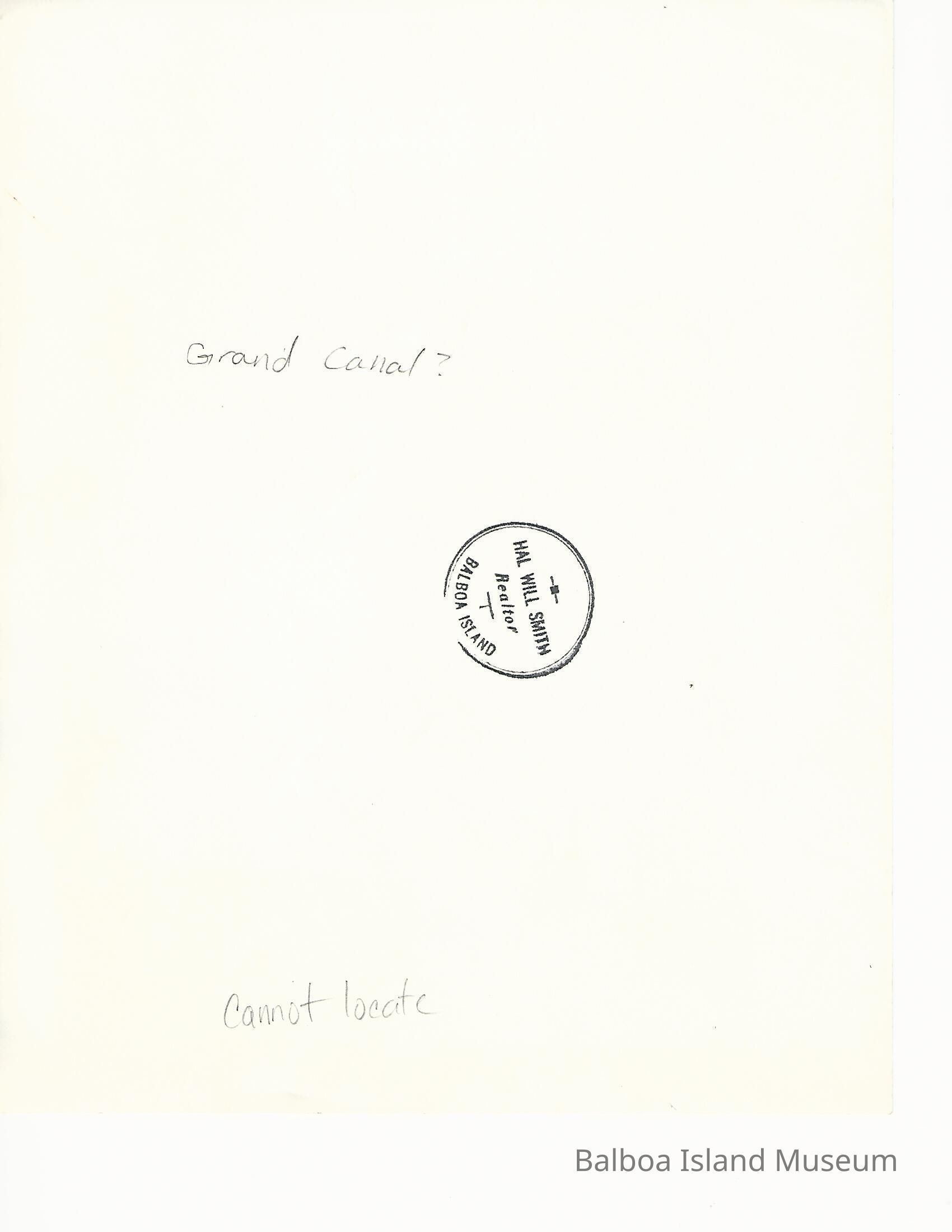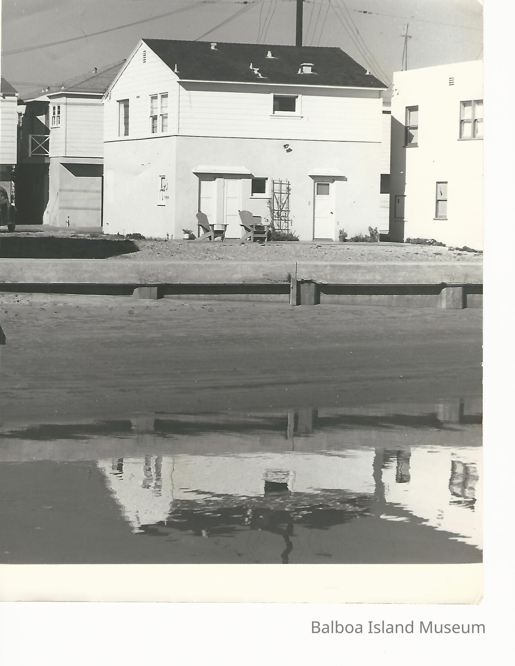 A photograph of a house on grand canal, possibly near the north bay front end. The house is no longer there. It is two stories with a small window on the second floor facing the water and larger sliding windows on the side. The side facing the water has a door into the house and two other doors that might be to utilities rooms for water and gas. There are also two chairs in the front yard and a small trellis. The bottom is cement or stucco and the two is wood slatting.Lexicon