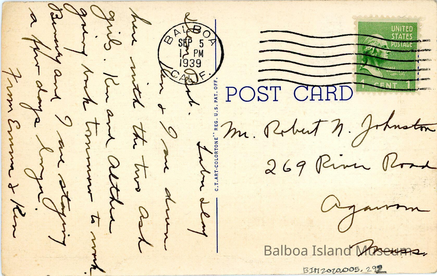 Sent on September 5, 1939 at 1 PM from Balboa. Sent to Mr. Robert N. Johnston in Agawam, Massachusetts. Sent from Emma & Ken.