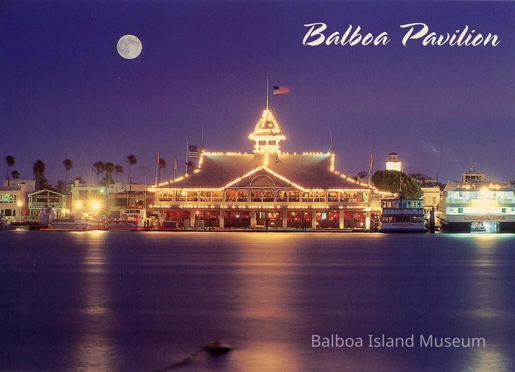 A large black and white photograph postcard of the Balboa Pavilion lit up under a full moon. The waterfront is mostly lit up including the Catalina Flyer that has its night time running lights on.