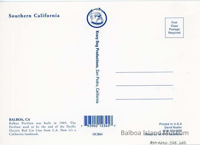 Unused. Published by Krazy Dog Productions. Printed by Davide Nadler. Photograph by William G. Hartshorn. First class postage required. Postcard number OCB04.