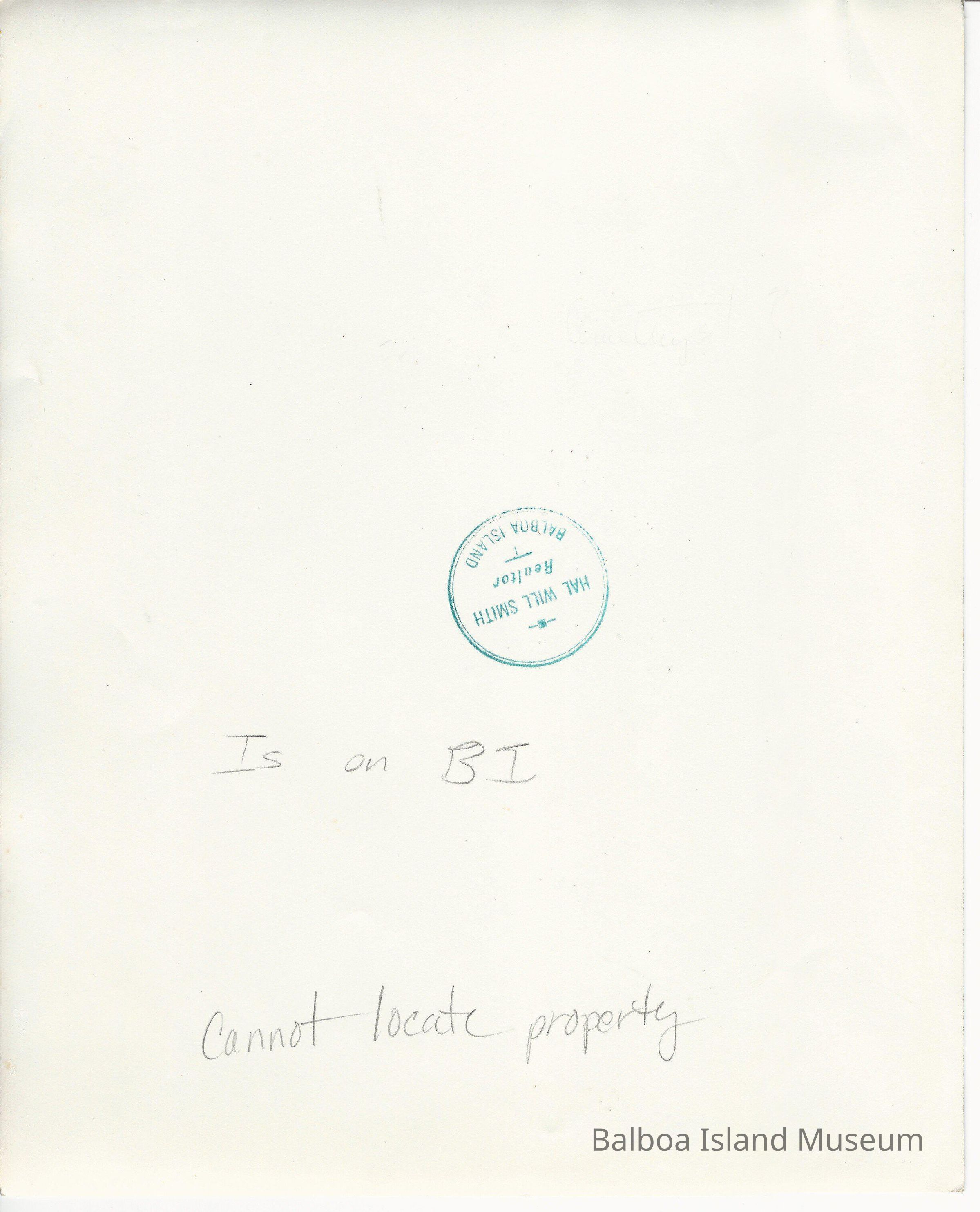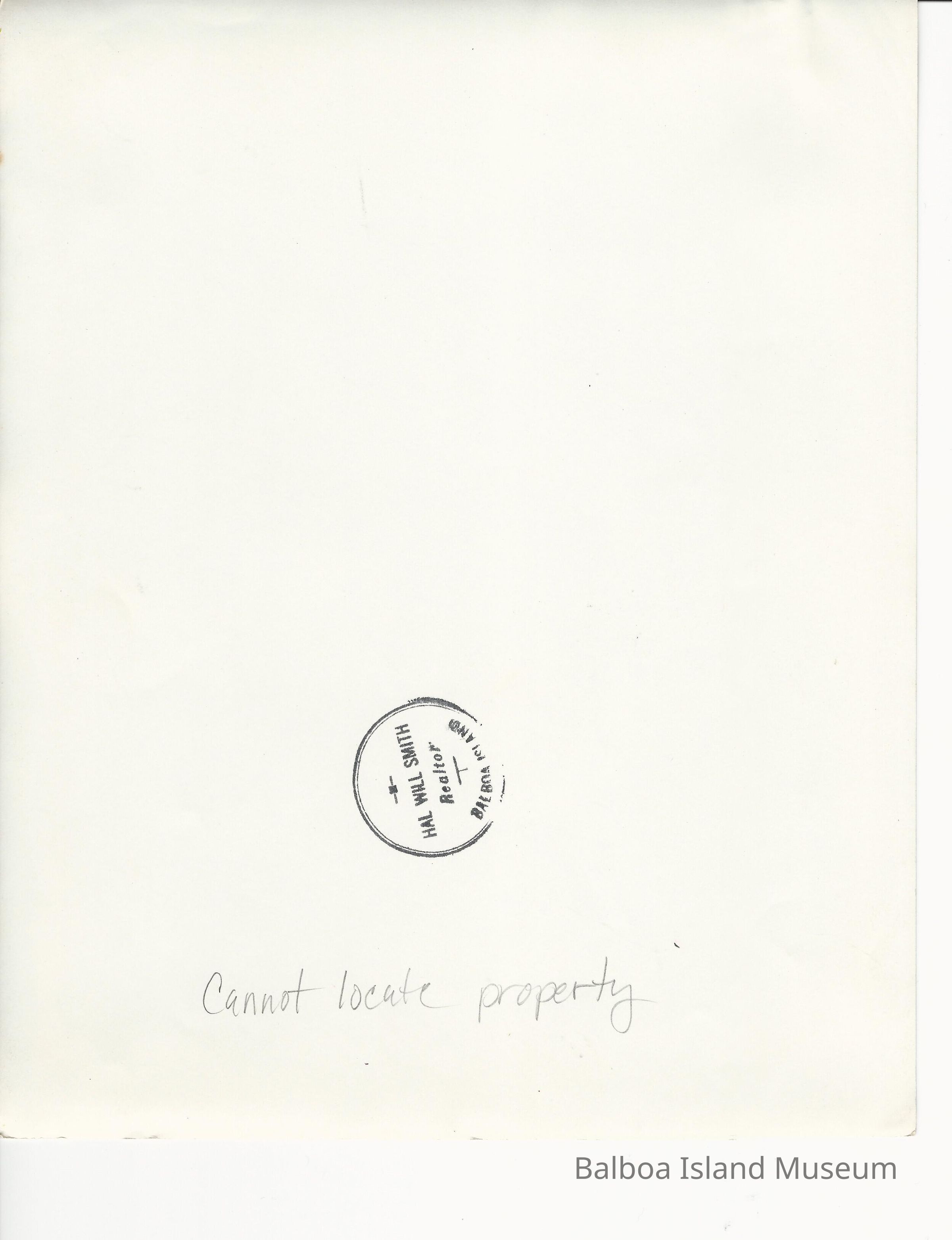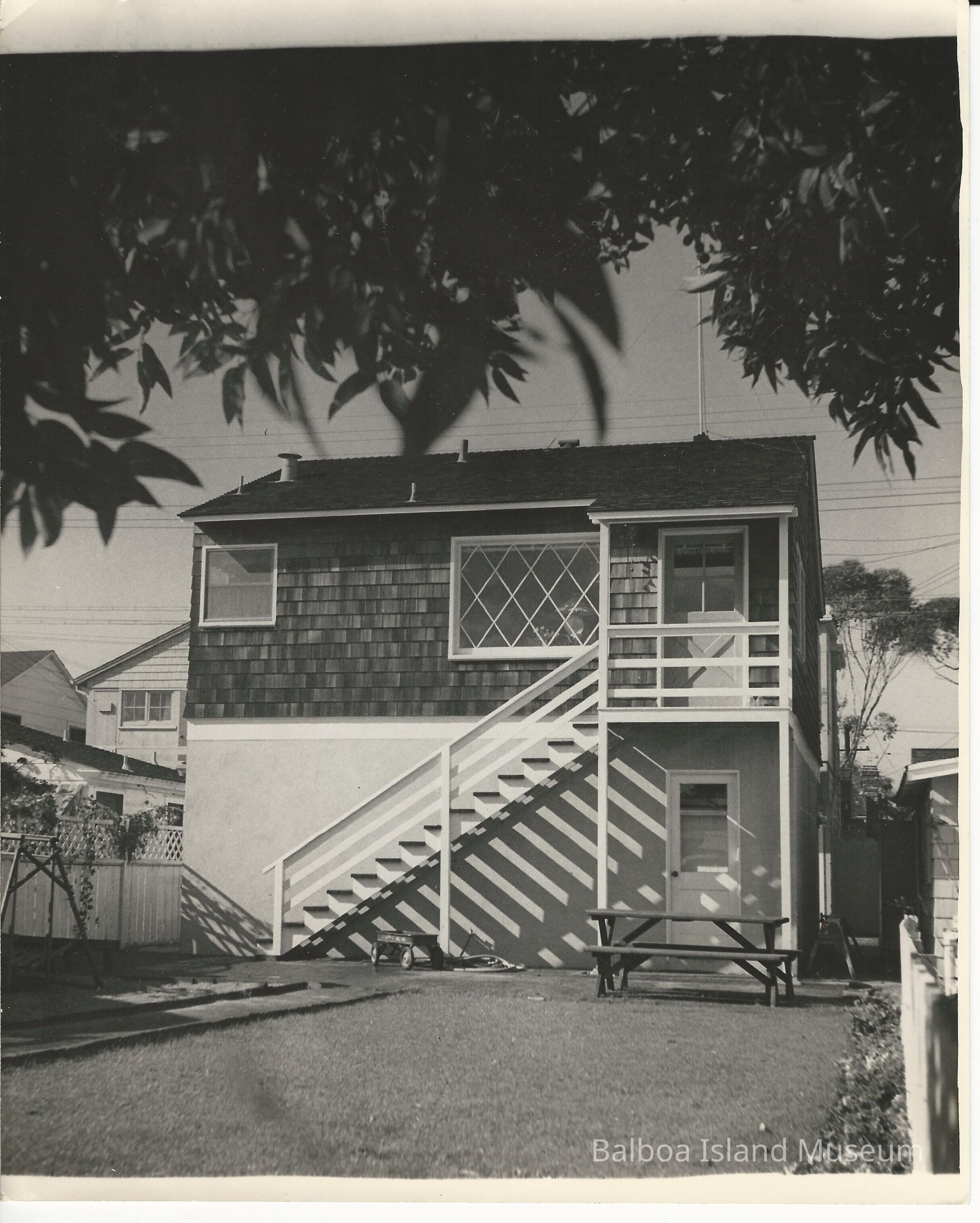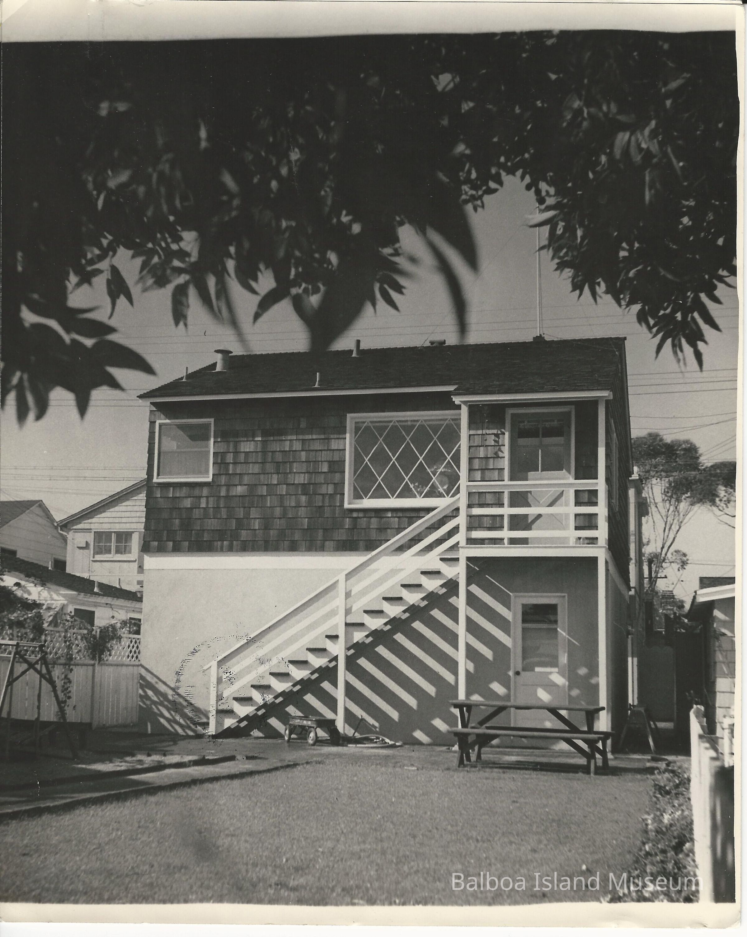 A 8x10 print of a house on Balboa Island. The house is two stories and has a cement or stucco bottom and a shingled second story. A staircase runs up the outside to a second story deck just outside what might be the front door of th house. There is also a second door on the bottom just belfore it. The second story has two windows, one large latticed window and a smaller pair on the corner, but the bottom story appears to have none except the window in the door. It's set back on the property and may either be a back unit or might be a house set further back on the property.