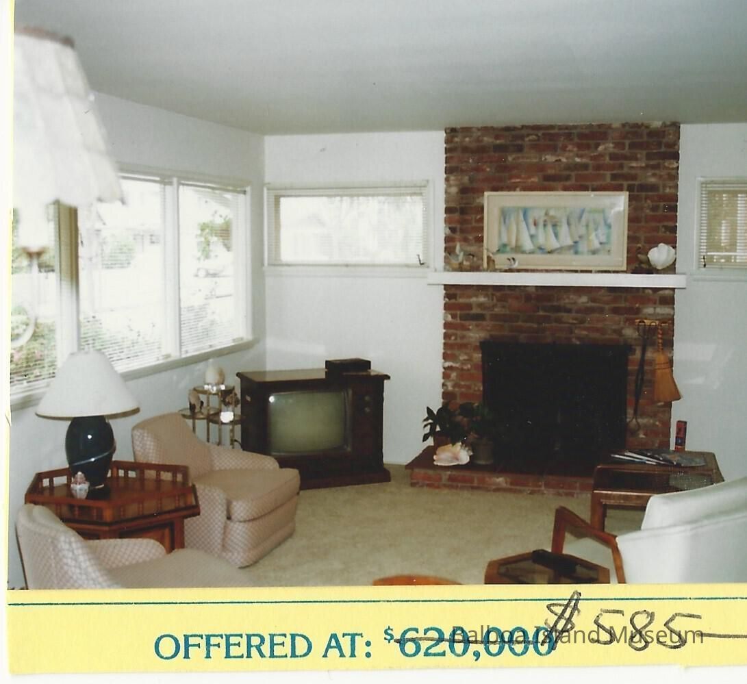 A photograph of an unknown livingroom. There's a painting of sailboats over the fireplace and a large blakc and white TV on the ground.