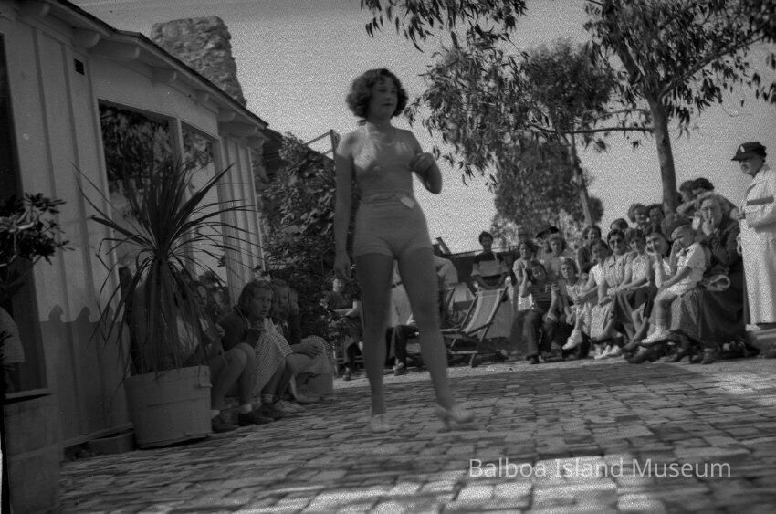 B&W photo of the model at a fashion show on Marine Avenue in front of Deschamps Clothing.