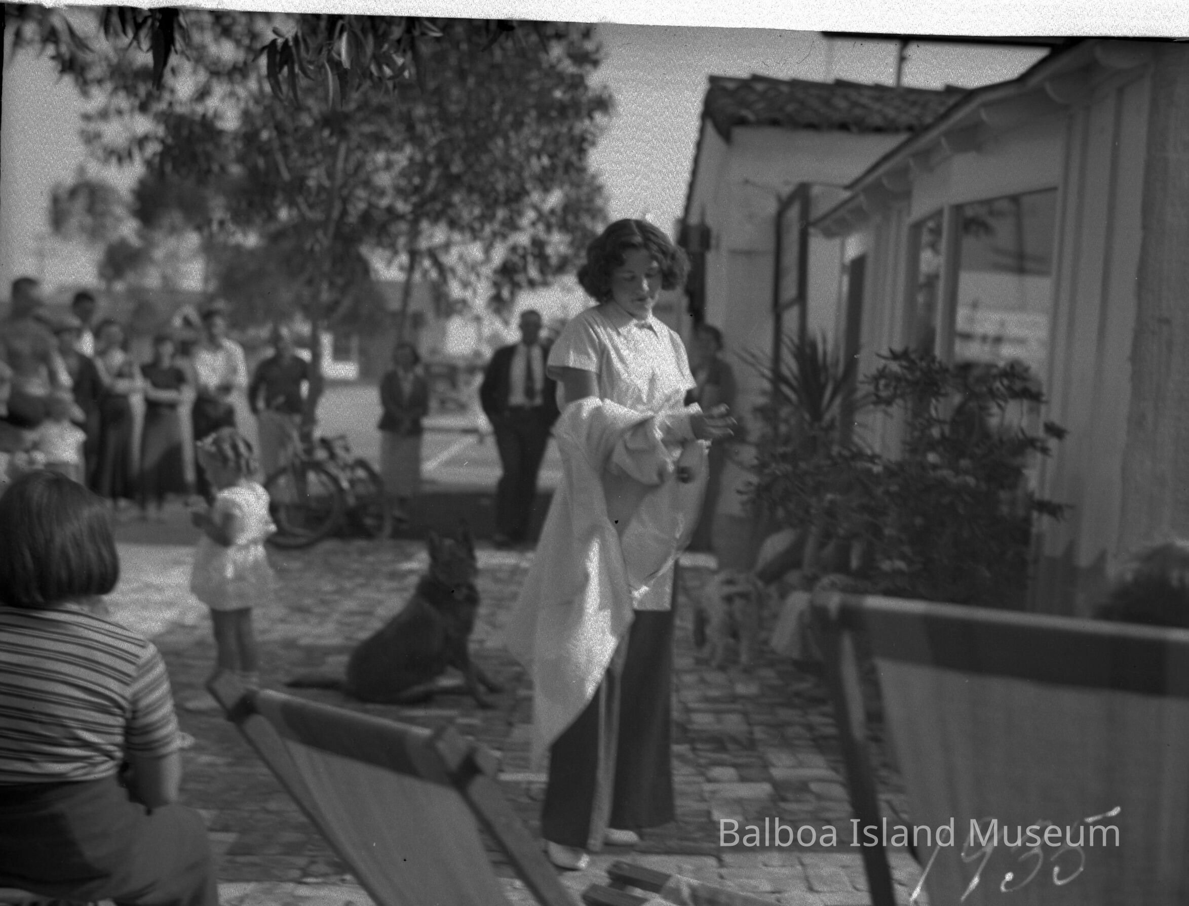 B&W photo of the model at a fashion show on Marine Avenue in front of Deschamps.