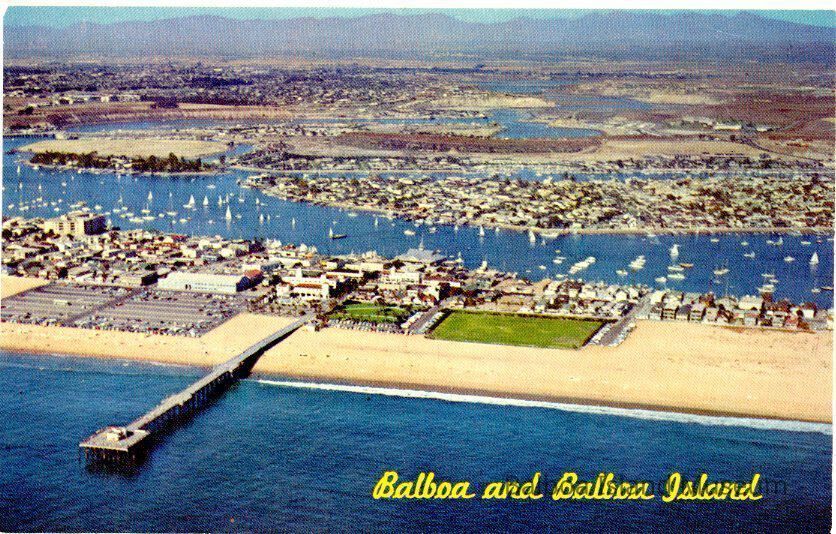 A color aerial photograph of the Balboa Beach area with a large green field visible to the right of the pier. The field is Balboa Peninsula Park.