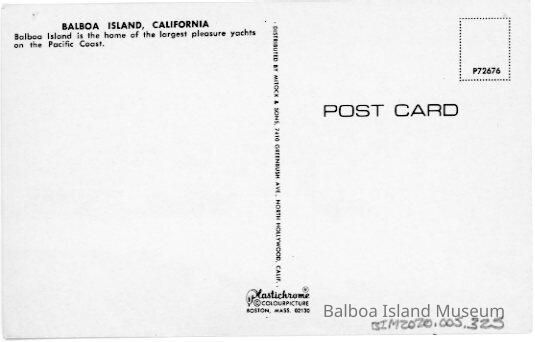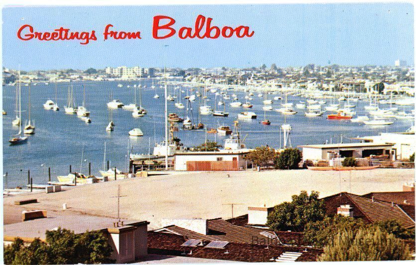 A color postcard of the harbor and a large empty area that might be the Coast Guard/Harbor Patrol location on Bayside Dr. The houses across the harbor from the open space are Balboa Island. The Balboa Pavilion is barely visi8ble in the left side of the postcard. The large building further back is 310 Fernando St on the Balboa Peninsula.