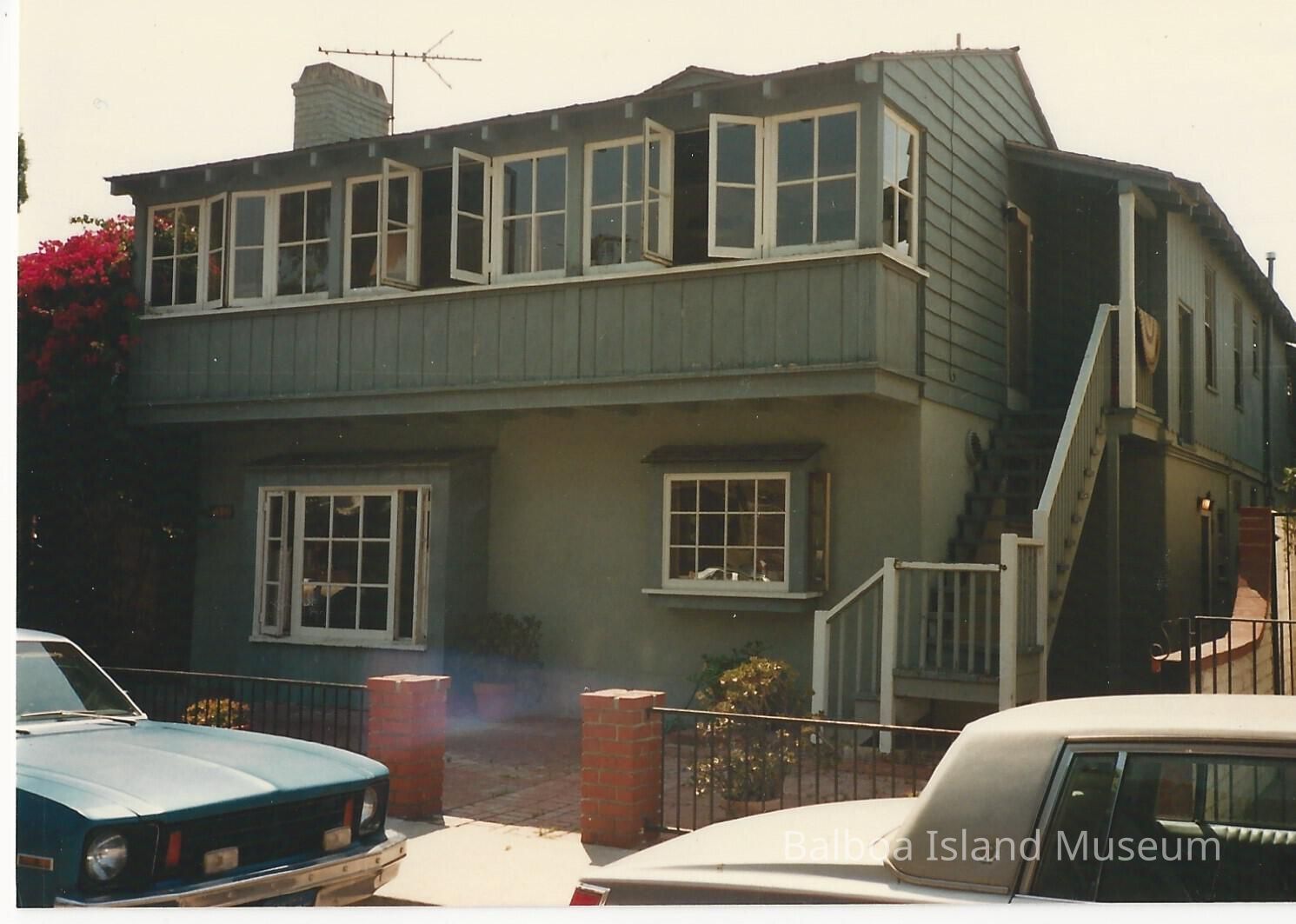 A photograph of 113 Onyx when it was dark grey and light grey. The house was built in 1932. It is a two-story building with a stucco ground floor and a vertical wood plank second floor. The first floor has two bay windows and the second hangs over the first with windows running along the front and sides- this space may have been a deck that was later enclosed. A set of stairs runs up the right side.