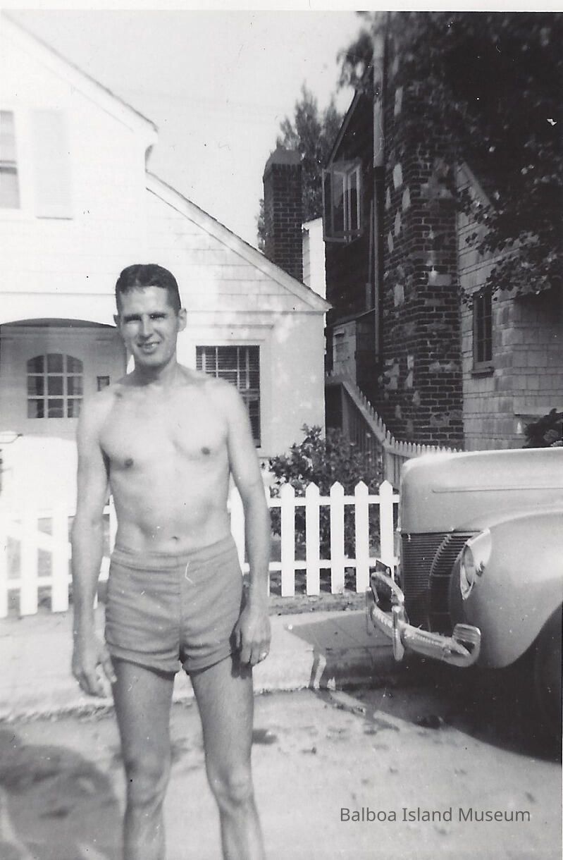 B&W photo of Emory Long standing in street in front of house. House in background is Swain house.Lexicon